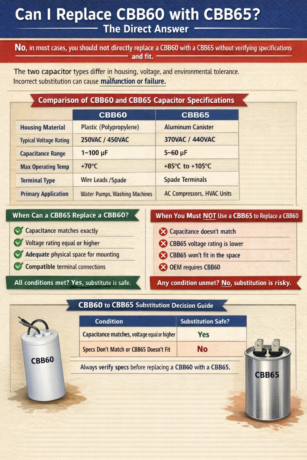 O resultado final: trate qualquer substituição de capacitor como um exercício de correspondência de especificações, não um atalho. O CBB60 e o CBB65 são ferramentas diferentes construídas para finalidades sobrepostas, mas distintas. Quando suas especificações estão alinhadas e a instalação física é compatível, o CBB65 pode ser um substituto perfeitamente válido – e às vezes superior – para um CBB60. Quando as especificações divergem ou as restrições físicas tornam a troca impraticável, forçar a substituição criará problemas que são muito mais caros para consertar do que adquirir a peça original correta.