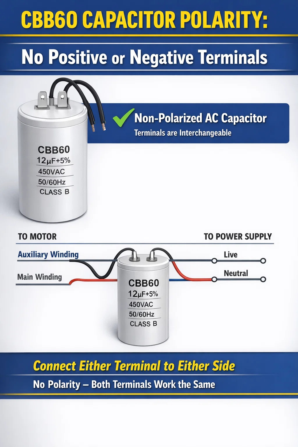 O capacitor CBB60 é nem positivo nem negativo . É um capacitor CA não polarizado, o que significa que não possui terminal positivo ou negativo designado. Você pode conectar qualquer terminal a qualquer lado do circuito sem qualquer risco de danos ou mau funcionamento. Esta é uma das características mais fundamentais que o distingue dos capacitores eletrolíticos, que são estritamente polarizados e irão falhar – ou até explodir – se conectados incorretamente.