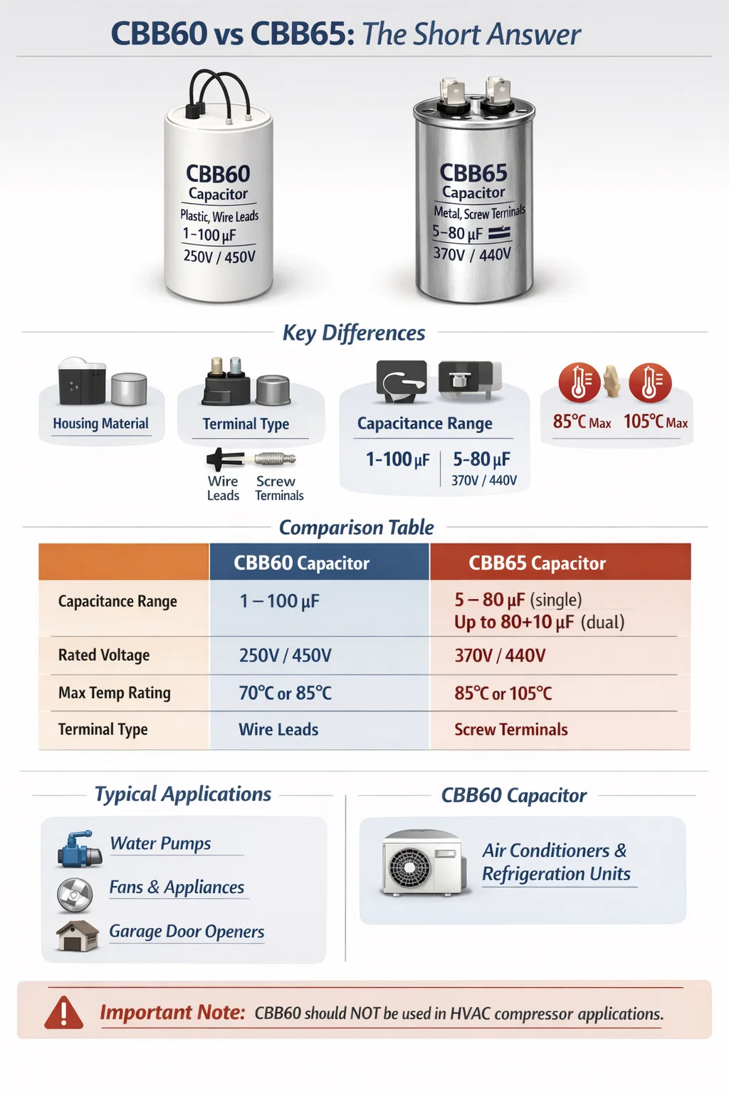 A diferença fundamental entre um Capacitor CBB60 e um capacitor CBB65 se resume à construção física e ao ambiente de aplicação pretendido. CBB60 é um capacitor cilíndrico com fio projetado principalmente para partida e funcionamento de motores CA monofásicos. , enquanto o CBB65 é um capacitor de lata de metal com terminal de parafuso projetado para aplicações mais pesadas, como compressores de ar condicionado e unidades de refrigeração. Ambos são capacitores de filme de polipropileno operando em circuitos CA, mas diferem significativamente em fator de forma, tipo de terminal, faixa de capacitância e resiliência térmica.