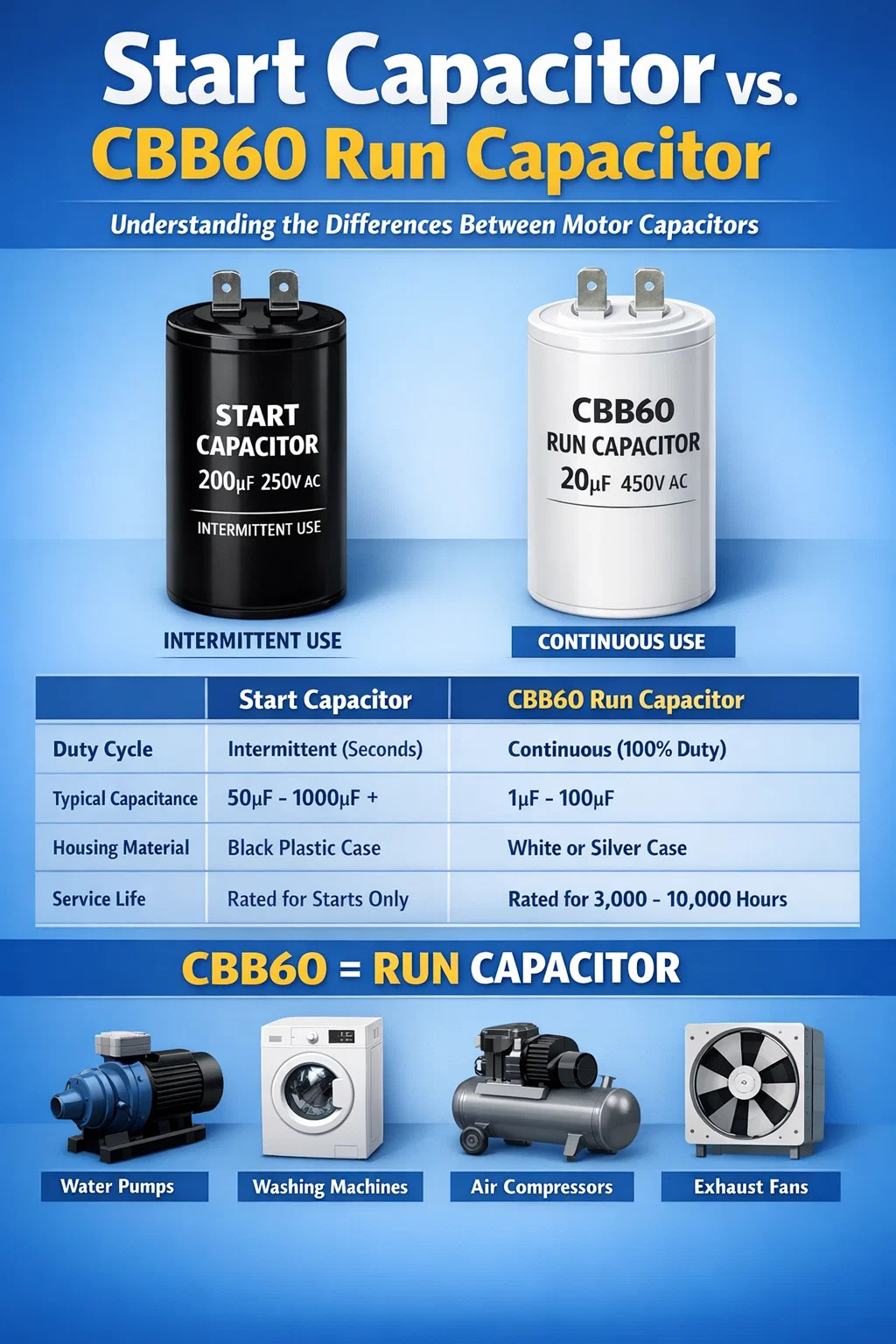 O Capacitor CBB60 é fundamentalmente um executar capacitor . Embora auxilie durante a partida inicial de um motor, seu principal objetivo de engenharia é permanecer energizado e conectado ao circuito do motor durante toda a operação do motor. Ao contrário de um capacitor de partida, que é desconectado por uma chave centrífuga quando o motor atinge aproximadamente 75% de sua velocidade nominal, o CBB60 fornece uma mudança de fase contínua para manter o torque, melhorar a eficiência e reduzir a vibração em motores de indução CA monofásicos.