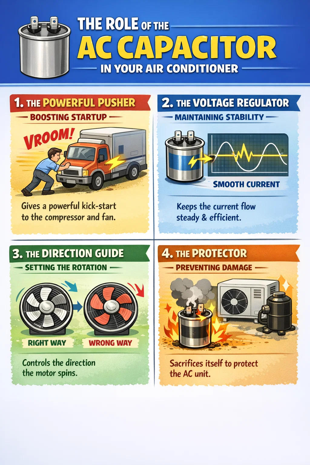 Papel orientador: O capacitor CA orienta o sentido de rotação do motor, alterando o "ritmo" da corrente que entra no motor. Se o capacitor estiver completamente quebrado, você poderá descobrir que a ventoinha está girando, mas na direção errada ou apenas oscilando no lugar.