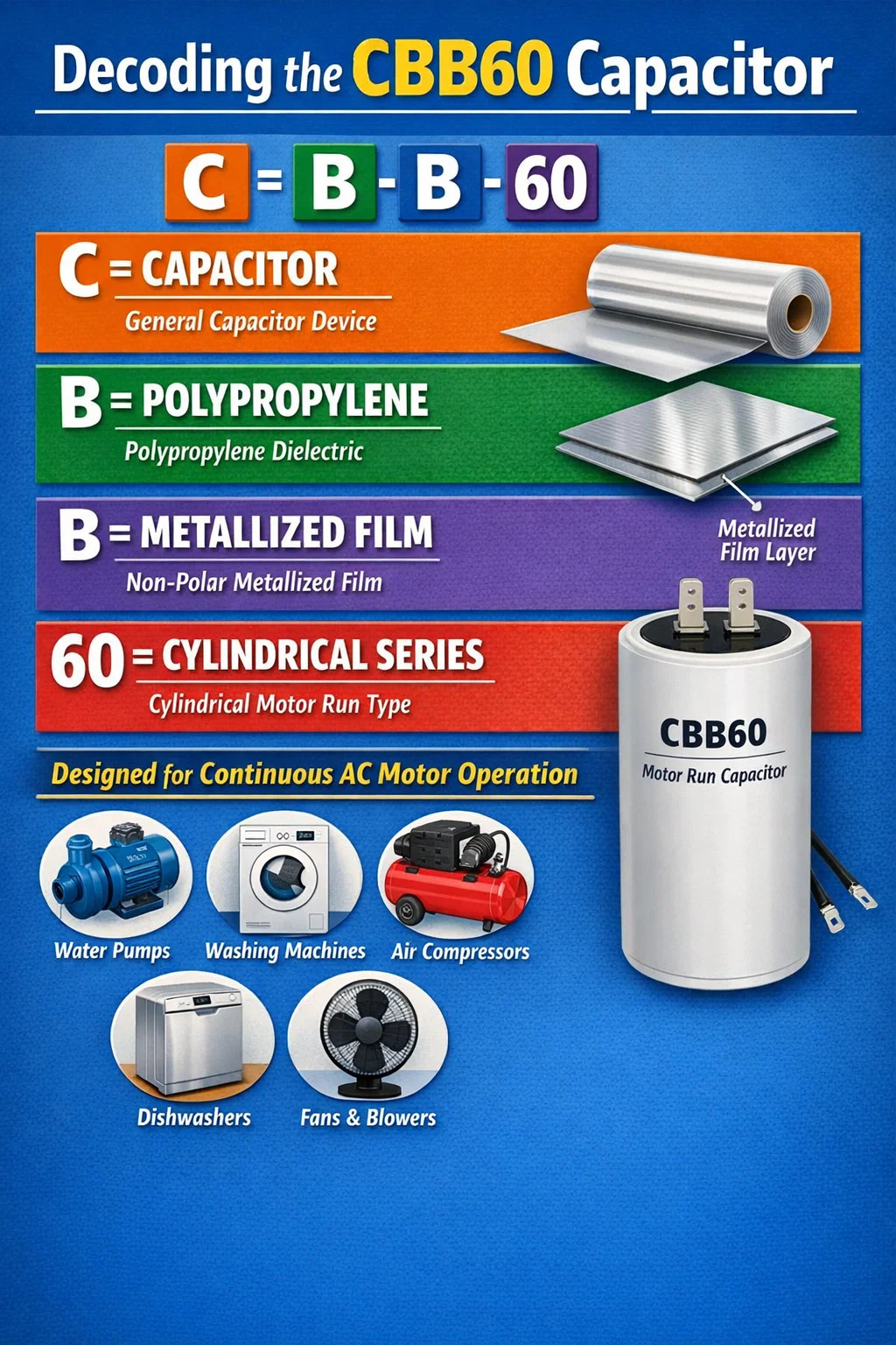 Para entender o que torna um CBB60 único em comparação com outros capacitores como o CBB61 ou CBB65, é necessário decompor os caracteres individuais usados na convenção de nomenclatura. Este padrão é amplamente adotado por fabricantes em todo o mundo para garantir compatibilidade e segurança em vários aparelhos movidos a motor CA.