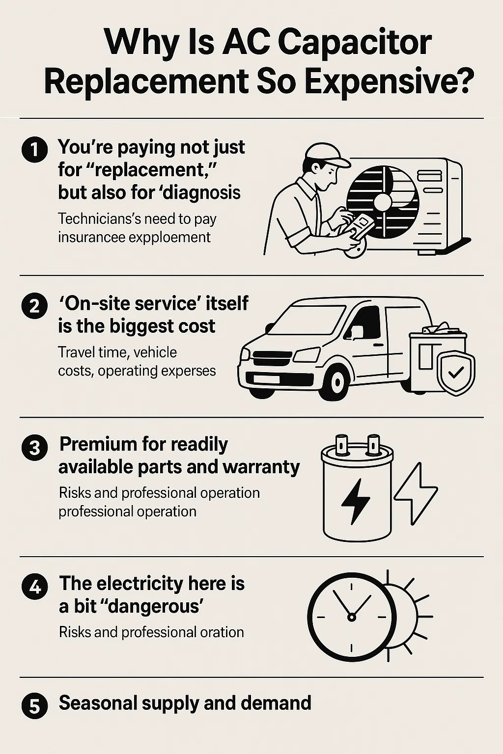 O valor do diagnóstico: quando um técnico chega à sua casa, primeiro ele precisa usar um multímetro e outras ferramentas para solucionar problemas. Se o capacitor estiver quebrado, isso é um problema menor; mas se o técnico for inexperiente e diagnosticar erroneamente o problema como uma falha do compressor, você poderá acabar pagando desnecessariamente pela substituição de um componente importante.